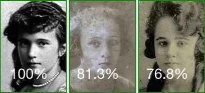 Three black and white vintage portraits of young Anastasia Romanov and Tasia with extraordinary facial comparison score results